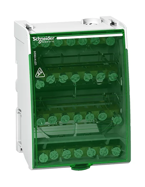 • Linergy DS – Tiered Tetrapolar Distribution Bar – 100A – 4×7 holes Reference: LGY410028 Schneider Electric, offers, among its Linergy range, a tiered tetrapolar distribution bar of 100 A caliber, for managing the power supply of your clients’ equipment. Clickable on DIN rail, its implementation is simple and fast. Connection is made simply through its terminals accessible behind a translucent protective cover, distributing the different phases and neutral over four levels, each with 6 terminations. Compact, it easily fits into the equipment set and allows immediate visibility of the connections with the circuit through its transparent green front. Setting up and maintaining your clients’ power devices is quick and easy thanks to the devices and accessories in the Linergy range.